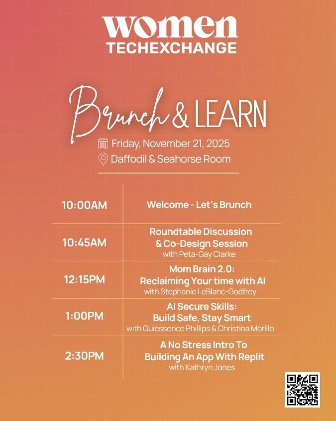Join us for the inaugural Brunch and Learn series. An energizing, hands-on gathering designed to build confidence, skills, and community around artificial intelligence. Over good food, inspiring conversation, and collaborative exploration, we’ll break down AI in ways that feel approachable, practical, and empowering — helping women step boldly into the future of technology with confidence and clarity.